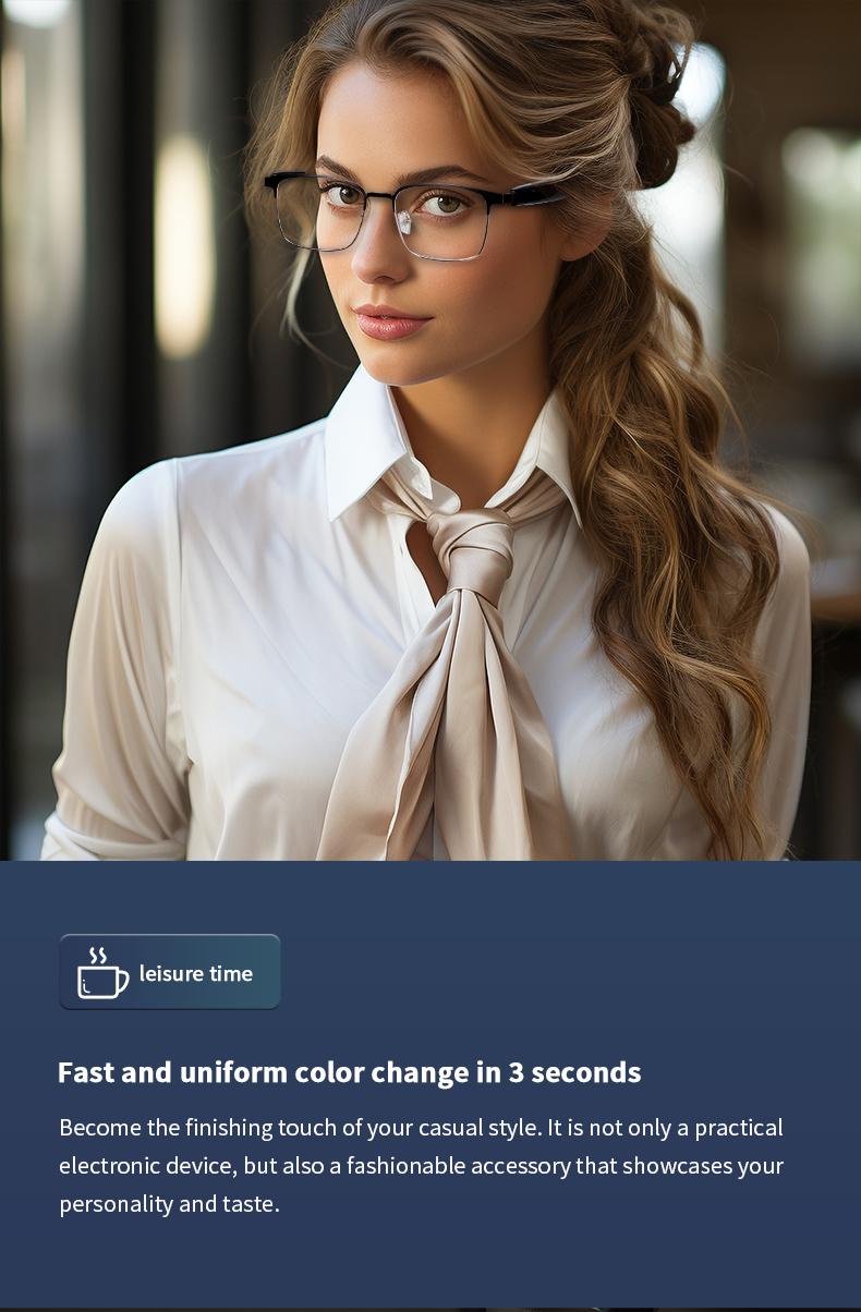 These smart glasses switch seamlessly between polarized sunglasses and blue light filtering lenses,providing eye protection in all environments.